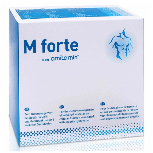 amitamin® M forte ist nicht als einzige Nahrungsquelle geeignet. Trocken und lichtgeschützt bei Raumtemperatur lagern. Außerhalb der Reichweite von kleinen Kindern aufbewahren. Nicht für Kinder und Jugendliche unter 18 Jahren. Unter ärztlicher Aufsicht verwenden. M forte enthält Arginin und Mikronährstoffe, die für die Funktionalität der Gefäßinnenwand (Endothel) und damit die männliche Erektion wichtig sind. Weitergehende Erläuterungen zur Zweckdienlichkeit in der Packungsbeilage.