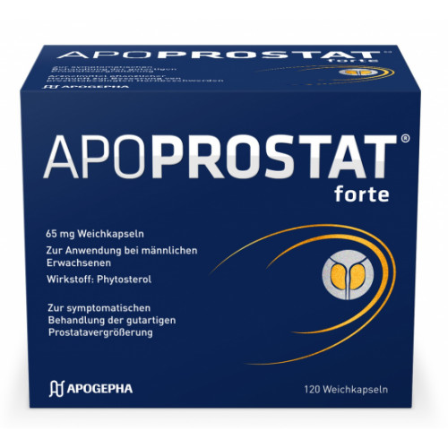 APOPROSTAT® forte 65 mg Weichkapseln. Wirkstoff: Phytosterol 65 mg. Anwendungsgebiet: Arzneimittel pflanzlicher Herkunft zur Besserung von prostatabedingten Harnbeschwerden. Zur symptomatischen Behandlung der benignen Prostatahyperplasie. Gegenanzeigen: Überempfindlichkeit gegen den Wirkstoff, Erdnuss, Soja, sonstige Bestandteile, sowie bei nachgewiesener Hypersitosterolämie. Warnhinweise: Enthält Erdnussöl und entölte Phospholipide aus Sojabohnen.