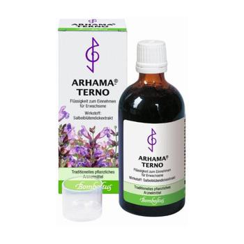100 ml Arhama®-Terno enthalten den Wirkstoff: 102,04 g Dickextrakt aus frischen Salbeiblütenständen (2,2 – 2,7 : 1) Auszugsmittel Ethanol 68 % (V / V). Die sonstigen Bestandteile sind: Methyl-4-hydroxybenzoat (Ph.Eur.), Saccharin-Natrium, gereinigtes Wasser, Ethanol 96 %.