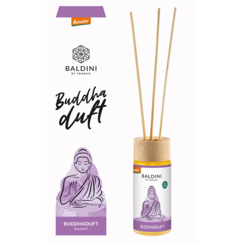 Buddhaduft Raumduftset ist ein Demeter-Raumduft aus 100 % naturreinen. ätherischen Ölen und demeter-Alkohol im dekorativen Glasflacon, inkl. 5 Bambusdiffusionsstäbchen. Baldini Buddhaduft ist der sanft beruhigende Naturduft mit Benzoe, Sandelholz und Tonka.