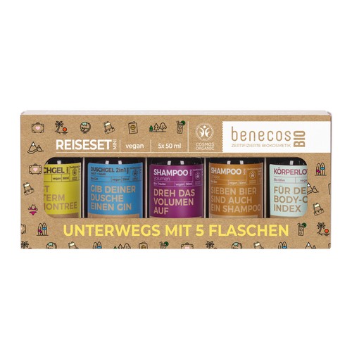 benecosBIO Mini-Set: 2 Duschgele, 2 Shampoos & 1 Körperlotion à 50ml. Perfekt für unterwegs.