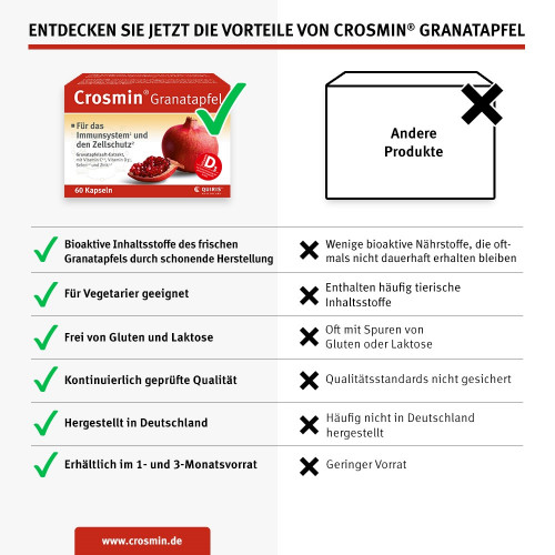 Crosmin® Granatapfel enthält einen hochwertigen Extrakt aus Granatapfel in Kombination mit Vitamin C und Vitamin D3 sowie den beiden Spurenelementen Zink und Selen. Für ein gesundes Immunsystem und starke Abwehrkräfte.