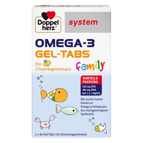 Dank einer neuen Herstellungstechnologie bietet Doppelherz system OMEGA-3 familiy einen hohen Gehalt der wertvollen Omega-3-Fettsäuren EPA und DHA in Form von fruchtig schmeckenden Gel-Tabs. Diese Darreichungsform ist für Kinder, Jugendliche und Erwachsene, also für die ganze Familie gut geeignet.