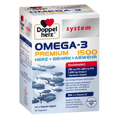 Doppelherz system OMEGA-3 PREMIUM 1500 Kapseln enthalten ein hochgereinigtes Konzentrat aus Seefischölen mit den wertvollen Omega-3-Fettsäuren EPA und DHA in Kombination mit Vitamin D3 und E. Durch die hohe Konzentration an Omega-3-Fettsäuren liefern bereits 2 Kapseln täglich 1.500 mg Omega- 3-Fettsäuren, davon 780 mg EPA und 495 mg DHA. Dadurch kann auch bei einem erhöhten Bedarf eine gute Versorgung mit den wertvollen Omega-3-Fettsäuren unterstützt werden.