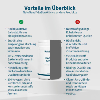 NatuGena GaSta® Aktiv wurde gezielt weiterentwickelt, um eine noch umfassendere Versorgung mit löslichen und unlöslichen Ballaststoffen sowie ausgewählten Bakterienkulturen zu bieten. Die überarbeitete Rezeptur enthält jetzt 21 mikroverkapselte Bakterienstämme mit insgesamt 23,5 Milliarden koloniebildenden Einheiten (KBE¹) pro Tagesdosis. Zuvor waren 10 Stämme mit 16,8 Milliarden KBE enthalten. Damit bietet die neue Formel ein breiteres Spektrum an Darmbakterien und eine höhere Gesamtzahl lebender Kulturen.