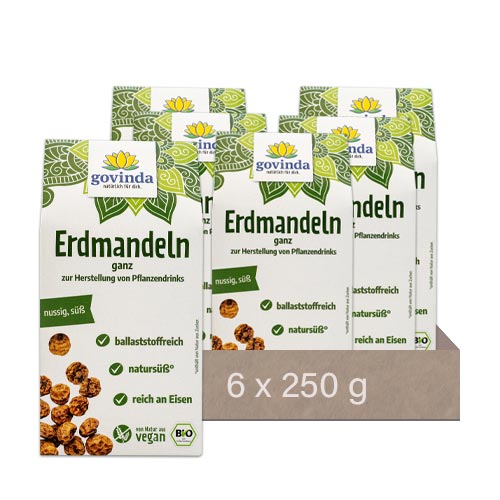 Klingt nach Nuss, ist aber keine Nuss. Denn sie gehört zur Gattung der Zypergräser und wächst als kleine Knolle am Ende der Wurzel des Grases (ähnlich wie Kartoffeln). Das Beste, sie alleine macht alles süß, denn Erdmandeln schmecken von Natur aus schon süß. Dazu liefert sie noch viele Ballaststoffe und ist reich an Eisen. Die Knolle der Erdmandel ist sehr hart, wird aber weich, wenn man sie in Wasser einweicht. Wer mag kann sie dann snacken oder zu einem natursüßen Pflanzendrink verarbeiten.
