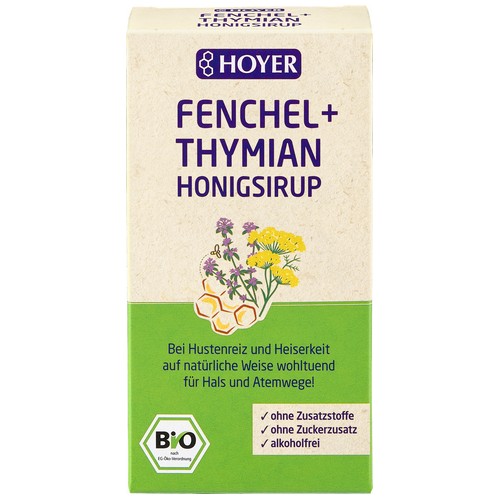 HOYER Fenchel- und Thymian-Honigsirup ist eine wohltuende Kombination von feinem Auslese-Blütenhonig mit wertvollem Fenchel- und Thymianöl.