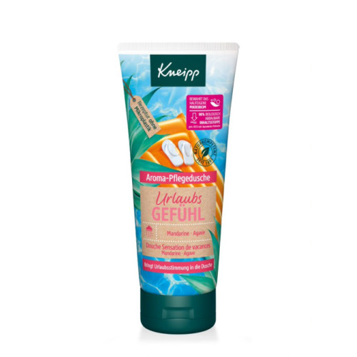 Urlaubsreif? Dann schnell unter die Dusche mit der Kneipp® Aroma-Pflegedusche Urlaubsgefühl. Genieße einen Mini-Urlaub mit dem sommerlichen Duft mit spritzigem ätherischen Mandarinenöl und dem Extrakt der blauen Agave - egal wo Du gerade bist. Die Dusche mit milder Pflegeformel verbessert das Hautgefühl während und nach dem Duschen. Die Formel schont und bewahrt das hauteigene Mikrobiom und sorgt für ein zartes und geschmeidiges Hautgefühl. Eine wissenschaftliche Studie bestätigt, dass die Hautfeuchtigkeit bei Anwendung bewahrt wird.