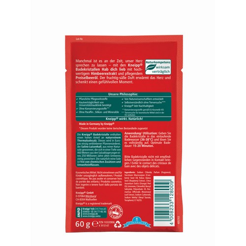 Manchmal ist es an der Zeit, unser Herz sprechen zu lassen - mit den Kneipp® Badekristallen Hab dich lieb mit hochwertigem Himbeerextrakt und pflegendem Preiselbeeröl. Der fruchtig süße Duft erwärmt das Herz und schenkt einen gefühlvollen Moment. Die Kneipp® Badekristalle enthalten einen hohen Anteil an naturreinem Thermalsolesalz. Dieses wird in Europas einzig verbliebener Pfannensiederei, der Saline Luisenhall, aus reiner Natursole gewonnen, die sich in einer Tiefe von 460 Metern aus den Salzablagerungen eines 250 Millionen Jahre alten Urmeeres stetig anreichert. Die natürlich reine Sole ist frei von chemischen Zusätzen und Umwelteinflüssen.