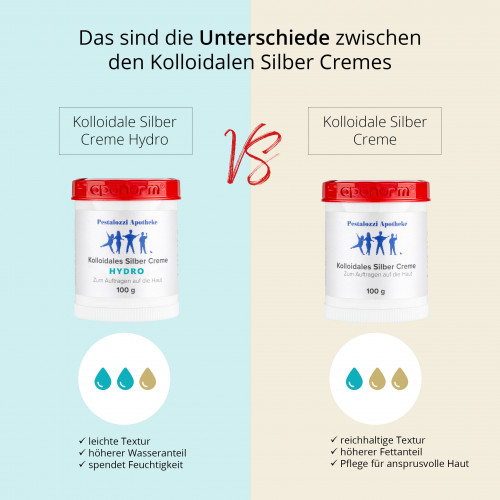 Die Kolloidales Silber Creme "Hydro" ist die "leichte" Variante unserer Kolloidales Silber Creme. Für die Herstellung wird eine verdünnte Basiscreme DAC verwendet. Da diese doppelt so viel Wasser und weniger Fett enthält, ist sie somit leichter auf die Haut aufzutragen.