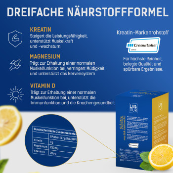 Zutaten: Kreatinmonohydrat Trimagnesiumdicitrat Süßungsmittel: Sorbit Säuerungsmittel: Citronensäure Zitronenaroma, Maltodextrin, Trennmittel: Siliciumdioxid Süßungsmittel Sucralose, Cholecalciferol (Vitamin D)