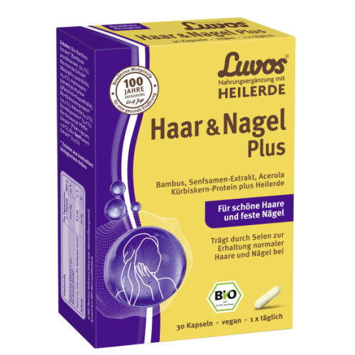 Luvos Haar & Nagel Plus ist ein optimal abgestimmter Bio-Komplex mit Heilerde und bio-zertifizierten pflanzlichen Zutaten. In dem hochwertigen Naturprodukt ist Heilerde mit bewährten pflanzlichen Naturstoffen kombiniert: mit siliziumreichem Bio-Bambus, Bio-Senfsamen-Extrakt, Bio-Kürbiskern-Protein und dem Bio-Enhancer Piperin aus Schwarzem Pfeffer. Enthält zudem Vitamin C aus der Acerola-Kirsche. Selen, aus dem Senfsamen-Extrakt, trägt zur Erhaltung normaler Haare und Nägel bei.