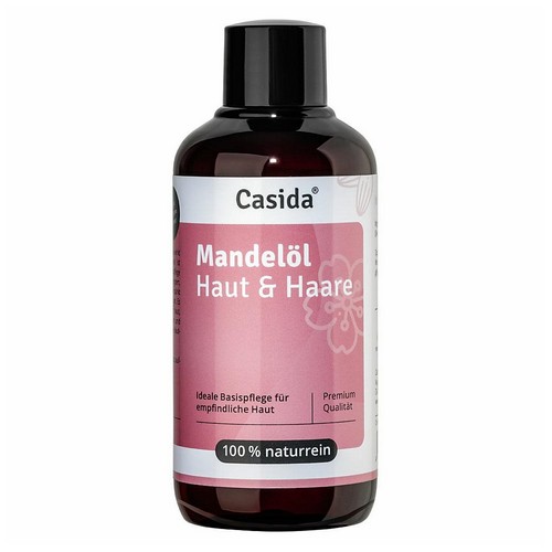 Mandelöl stärkt die Haut, lindert Hautirritationen und fördert die Zellregeneration. Sehr gut auch als Basisöl für Massagen und zum Mischen mit ätherischen Ölen geeignet.