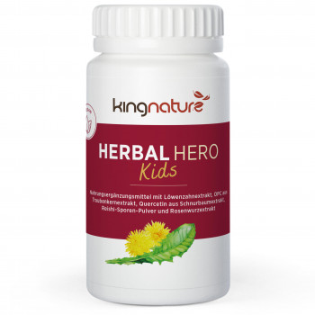 - Herbal Hero Kids – 120 vegane Kapseln mit Löwenzahnextrakt, OPC aus Traubenkernextrakt, Quercetin aus Schnurbaumextrakt, Reishi-Sporen-Pulver und rosavin-haltigem Rosenwurzextrakt.