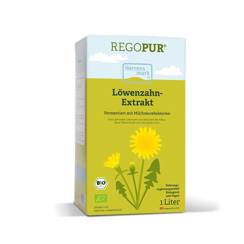 REGOPUR® von Herrens Mark ist ein unpasteurisiert biologisch hergestelltes Nahrungsergänzungsmittel aus dem Saft der gepressten Blüten, Blätter und Wurzeln des Löwenzahns.