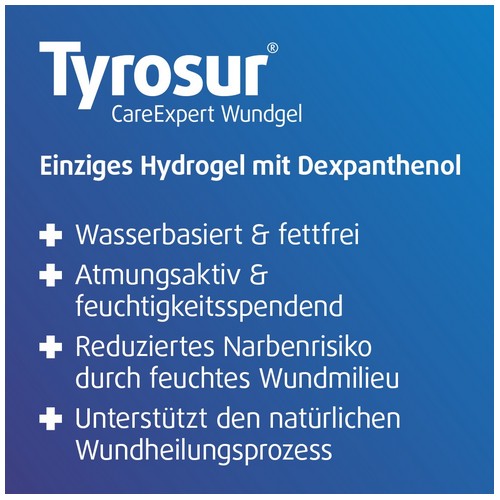Tyrosur® CareExpert Wundgel ist zur Unterstützung während des natürlichen Wundheilungsprozesses bestimmt. Sollten sich Ihre Beschwerden verschlimmern oder keine Besserung eintreten, suchen Sie bitte Ihren Arzt oder Apotheker auf.