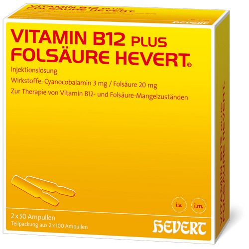 - Sonstige Bestandteile:Vitamin B12 Hevert: Ammoniumsulfat, Natriumchlorid, Salzsäurelösung, Wasser für Injektionszwecke. Folsäure Hevert: Natriumchlorid, Natriumhydroxidlösung, Wasser für Injektionszwecke.