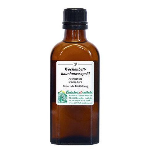 Das Wochenbettbauchmassageöl der Bahnhof-Apotheke trägt zur Rückbildung nach der Geburt bei ohne Nachwehen anzuregen, strafft das Gewebe der Bauchhaut und unterstützt die Bauchmuskulatur. Das Öl hat sich in der Hebammenhilfe bewährt. Halten Sie gegebenenfalls mit Ihrer Hebamme Rücksprache.